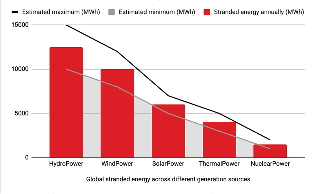 Considering all sources, the total global stranded energy could range between 27,000-41,000 MWh annually, with the majority stemming from renewable sources like hydropower, wind, and solar.